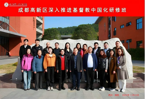 11月24日至27日,为深入学习贯彻习近平新时代中国特色社会主义思想、中共二十大和二十届四中全会精神,进一步加强基督教教职人员、骨干信教群众综合能力,系统推进我区基督教中国 化走深走实,成都高新区基督教三自爱国会联合四川“两弹一星”干 部学院举办了“成都高新区深入推进基督教中国化研修班”。全区基督教堂点负责人、教职人员等共 19 位学员参加培训。    24日上午,学员们在四川两弹一星干部学院集体合影后,举行开班仪式,四川两弹一星干部学院副院长梁胜朝致辞,成都市 及成都高新区基督教三自爱国会主席赵刚牧师讲话。