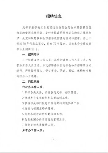 【招租启事】我单位有停车场一处,毗邻天府广场,位置绝佳,地下车位50余席,地面车位若干。欲公开招租。诚意洽谈,且具备相关资质的单位请于本月10日前致电:028-86752918。成都市基督教三自爱国运动委员会(2025年7月2日)