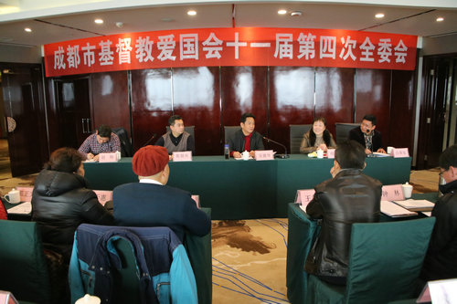 成都市基督教三自爱国会于2016年2月2日10:00在成都云龙宾馆召开了第十一届第四次委员会,胡雅丽副主席兼秘书长向大会报告了《成都市基督教三自爱国运动委员会2015年工作总结及2016年工作计划》,会议通过了《成都市基督教教职人员行为规范》(试行)。会上张贤升主席代表爱国会向全体委员提出加强学习、提升自己,守住真道、建造自己,传扬福音、见证基督三个方面的新年希望,市民宗局吴德华副局长对全体委员提出了四个方面的期望和要求:一是更加牢固树立法治理念,二是大力加强自身建设,三是高度重视安全工作,四是积极开展公益慈善活动。