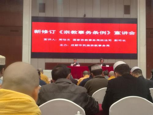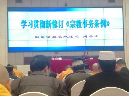 为全面贯彻落实全国宗教工作会议和习近平总书记重要讲话精神,深入领会和学习贯彻新修订《宗教事务条例》(以下简称《条例》),在市民宗局的精心组织下,10月19日上午,我会组织全体班子成员及工作人员参加了新修订《宗教事务条例》宣讲会学习活动。本次宣讲活动由市委统战部副部长、市民宗局田野局长主持,国家宗教局政法司副司长周怡文主讲,宣讲会分别从《条例》修订基本情况、修订主要内容和学习宣传贯彻要求三个方面进行了详实的讲述。宣讲会结束后田野局长做了学习总结,并提出三点要求,一是要深入学习党的十九大精神,切实把握精神实质,以十九大精神引领全市民族宗教工作不忘初心,方得始终;二是要深入学习贯彻好新《条例》;三是要维护良好的社会环境,维护民族宗教界的和谐稳定,特别注重加强安全稳定工作,迎接十九大胜利召开。