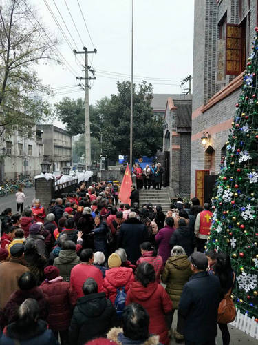 12月21日至26日,全市基督教主要堂点开展了形式多样的圣诞崇拜和庆祝活动,在阵阵欢快、声声温馨的祝福中,欢快愉悦地度过了2019年圣诞佳节。圣诞庆祝活动得到了省、市、区各级党委和政府相关部门一如既往的大力关心、支持和指导,尤其是在安保、交通、医疗、消防等各方面提供了坚实有效的应急安全保障。           其中城区直管两堂(上翔堂和恩光堂)在圣诞节当天早上8点30分,分别举行了庄严而隆重的升旗仪式,500余信众参加。升旗仪式中,由教牧同工组成的护旗仪仗队踏着矫健的步伐护送国旗,在全体教牧同工和信众的注目下伴随着《义勇军进行曲》国旗冉冉升空。圣诞活动期间城区直管两堂开展圣诞主题崇拜各一场,同乐会各一场,上翔堂开展音乐崇拜晚会四场,恩光堂开展音乐崇拜晚会三场,期间(含主日崇拜)两堂共计16000余人次参加系列活动。                  红红火火过圣诞,欢欢喜喜度佳节。隆重的圣诞庆祝活动,将更加团结和引领全市基督徒爱国爱教、坚定文化自信,坚持基督教中国化方向,走好宗教与社会主义社会相适应的道路,在新的一年里为成都建设全面体现新发展理念的城市和大城崛起发挥基督教更加积极的作用。     24晚上平安夜开始之初,张贤升牧师宣读了国家宗教局对全国基督教界的问候信。