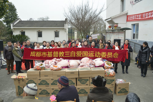 市基督教三自爱国会在崇州市基督教同工的陪同下于1月11日前往崇州市公议敬老院开展迎新春送温暖关爱活动。本次活动送去猪肉654斤,以及糕点、糖果、水果等慰问品,共计价值贰万余元。崇州市基督教弟兄姊妹为老人们准备了精彩的节目表演,共同庆祝新春佳节的到来。                  自2014年以来我会坚持每年在春节前开展慰问关怀活动。活动得到了当地政府的充分肯定以及老人们的热烈欢迎。关爱活动充分体现了成都市基督教爱国爱教、做光做盐、服务社会的优良传统。