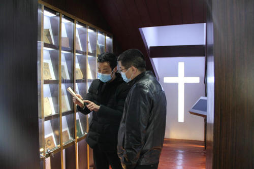 2月5日,市委统战部傅军副部长率队调研我会,市委统战部一级调研员张小鸽,民宗处处长刘畅、副处长李万晖陪同调研。调研组一行听取了我会副主席兼副秘书长胡雅丽关于落实“双暂停”、春节值班及疫情防控等工作情况汇报,并参观了成都市基督教陈列馆和上翔堂。           傅部长对基督教陈列馆给予了高度评价,希望可以继续坚持基督教中国化方向,积极引导信徒坚持“三自”原则办好教会。场所要严格落实“双暂停”管理,特别是要加强在春节期间的疫情防控、消防安全和值班工作。