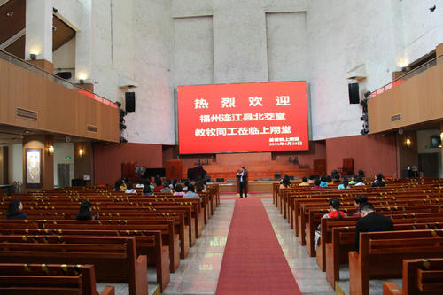 4月23日,福州市连江县基督教北茭堂教牧同工一行30人到访我会参观了成都市基督教陈列馆和基督教上翔堂。我会副主席兼秘书长胡雅丽、副主席兼上翔堂主任白荣发牧师全程陪同。            通过对陈利馆的参观,北茭堂教牧同工一行对基督教传入四川及成都的历史,基督教为成都的社会、经济、文化建设所作出的积极贡献进行了深入了解,在参观上翔堂时就教堂的管理、文化和基督教中国化示范场所创建工作等方面与上翔堂教牧同工进行了交流学习。