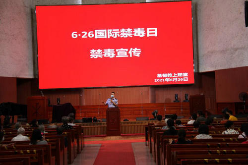 6月26日是“国际禁毒宣传日”,根据《成都市民宗局关于开展2021年“全民禁毒集中宣传月”活动的通知》(2021-89)要求,基督教上翔堂高度重视并积极开展禁毒宣传工作,让“健康人生•绿色无毒”的理念深入人心,以优异成绩庆祝中国共产党建党100周年。          一是本堂教职人员参加四川省委统战部在大慈寺开展的四川省6•26“全民禁毒集中宣传月”启动仪式,并及时向本堂教牧人员和工作人员传达学习相关会议精神;二是悬挂“喜迎建党100周年•共享无毒健康人生”宣传标语;三是邀请了西御河派出所李明警官,给本堂义工和信徒介绍了毒品在中国的历史及毒品种类的演变,通过实例讲解了毒品对吸毒者、家庭和社会的危害,同时讲解我国禁毒相关的法律知识等。   本次活动共计100余人参加,通过禁毒宣传系列活动的开展,让广大教牧同工和信教群众了解到了毒品和对个人、家庭和社会的危害性,提升了禁毒工作的法治意识。