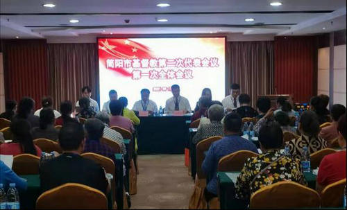 简阳市基督教三自爱国会依据《宗教团体管理办法》的规定,在简阳市民宗局的指导下,于2021年9月17日在简阳市昕雅图酒店顺利召开简阳市基督教第二次代表大会。     简阳市基督教三自爱国会第二次代表大会共51位参会代表,听取审议了届简阳市基督教第一届会议工作报告,修订了《简阳市基督教三自爱国会章程》等。选举产生了简阳市基督教三自爱国会第二届领导班子和第二届监事会领导班子。陈道江牧师当选为简阳市基督教三自爱国会第二届主席,杨朝杰副牧师当选为第二届监事会监事长。